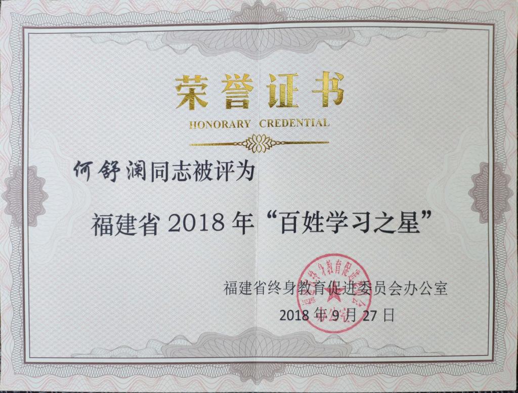 本次“百姓學(xué)習(xí)之星”評(píng)選活動(dòng)由福建省終身教育促進(jìn)委員會(huì)主辦,經(jīng)全省各單位推薦,層層篩選,專家最終評(píng)選,我院何舒瀾同志最終入圍。何舒瀾老師秉承終身學(xué)習(xí)理念,刻苦鉆研業(yè)務(wù),把學(xué)習(xí)、工作與創(chuàng)新有機(jī)結(jié)合。將所學(xué)知識(shí)技能貫穿于教書育人,積極指導(dǎo)學(xué)生參與技能競(jìng)賽、社會(huì)實(shí)踐、社團(tuán)等活動(dòng)。將所學(xué)知識(shí)技能服務(wù)于社會(huì),積極參與黨日活動(dòng)、社區(qū)服務(wù)、三下鄉(xiāng)等活動(dòng)宣講和傳播中醫(yī)藥養(yǎng)生知識(shí)。近年來,該同志獲國家級(jí)獎(jiǎng)項(xiàng)5項(xiàng)、省級(jí)獎(jiǎng)項(xiàng)11項(xiàng)、院級(jí)獎(jiǎng)項(xiàng)9項(xiàng)。