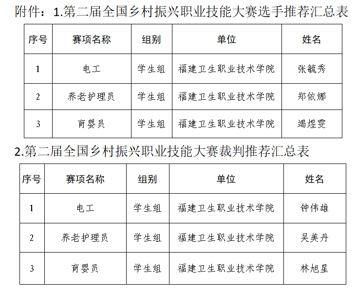 根據(jù)《福建省人力資源和社會(huì)保障廳關(guān)于做好第二屆全國鄉(xiāng)村振興職業(yè)技能大賽參賽報(bào)名工作的通知》要求,經(jīng)二級(jí)學(xué)院推薦,繼續(xù)教育學(xué)院審核,擬推薦以下學(xué)生和老師報(bào)名第二屆全國鄉(xiāng)村振興職業(yè)技能大賽參賽選手和裁判員。