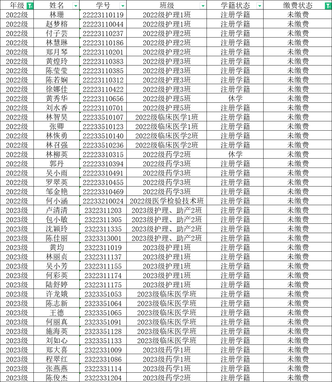 2024年1月10日開始,福建衛(wèi)生職業(yè)技術學院高等學歷繼續(xù)教育學生學費均在“福建衛(wèi)生職業(yè)技術學院”財務平臺收繳,截至2024 年2月20日,2024學年學費繳納已截止,林珊等40位學生(名單見附件)未按規(guī)定繳費。請相關學生從即日起七日內(nèi)與本校繼續(xù)教育學院聯(lián)系,辦理休學或者退學等相關手續(xù),逾期我院將對該批學生按照自動退學處理。