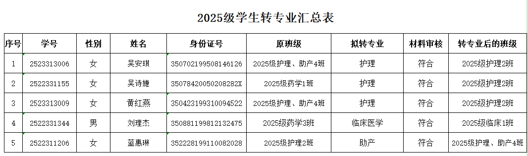 根據(jù)《福建衛(wèi)生職業(yè)技術(shù)學院高等學歷繼續(xù)教育學生學籍管理規(guī)定》(閩衛(wèi)院繼〔2025〕2號文)第五章第二十九條的有關(guān)規(guī)定,我院高等學歷繼續(xù)教育2025級學生吳安琪等5人因工作需要等原因,提出轉(zhuǎn)專業(yè)申請,經(jīng)班主任審核,學院研究審議,該5名學生符合轉(zhuǎn)專業(yè)條件,同意轉(zhuǎn)入相關(guān)專業(yè)學習。
