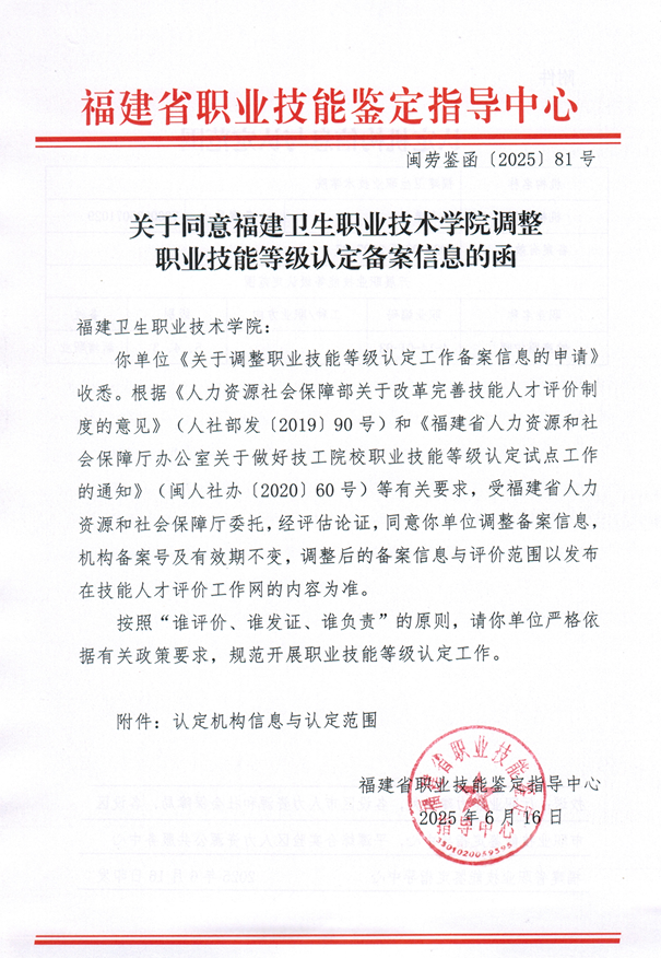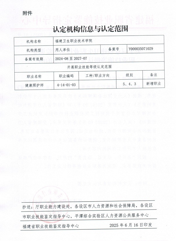 近日,我校成功通過福建省職業(yè)技能鑒定指導(dǎo)中心的嚴(yán)格審核并獲批備案,正式新增“健康照護(hù)師”職業(yè)技能等級認(rèn)定資質(zhì)。標(biāo)志著我校在職業(yè)技能人才培養(yǎng)領(lǐng)域邁出了重要一步,今后可向本校相關(guān)專業(yè)學(xué)生提供專業(yè)的健康照護(hù)師技能等級評價(jià)服務(wù)。