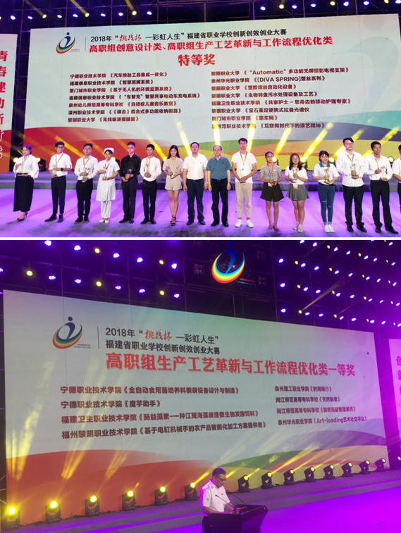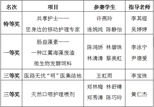 6月8日至9日,在泉州市舉辦2018年福建省職業(yè)學(xué)?!疤魬?zhàn)杯——彩虹人生”創(chuàng)新創(chuàng)效創(chuàng)業(yè)大賽中,我院創(chuàng)新創(chuàng)效創(chuàng)業(yè)項(xiàng)目《共享護(hù)士——您身邊的移動(dòng)護(hù)理專家》榮獲高職組特等獎(jiǎng),《腸益藻素·一種江蘺海藻廢渣微生物發(fā)酵飼料》榮獲高職組一等獎(jiǎng),《醫(yī)路無(wú)憂 “明”醫(yī)集結(jié)地》和《天然口咽護(hù)理噴劑》榮獲高職組三等獎(jiǎng),學(xué)院榮獲優(yōu)秀組織獎(jiǎng)。