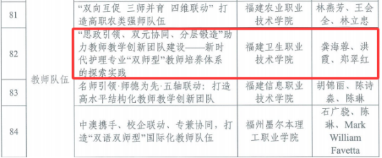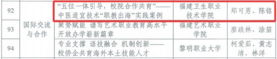 近日,福建省職業(yè)技術教育中心公布了2025年全省職業(yè)教育改革發(fā)展典型案例名單,我校報送的《思政引領、雙元協(xié)同、分層鍛造”助力教師教學創(chuàng)新團隊建設——新時代護理專業(yè)“雙師型”教師培養(yǎng)體系的探索實踐》(公共衛(wèi)生與健康管理學院)、《五位一體引導,校院合作共育”——中醫(yī)適宜技術“職教出海”實踐案例》(醫(yī)學院)2個案例分別入選“教師隊伍”、“國際交流與合作”類型典型案例。