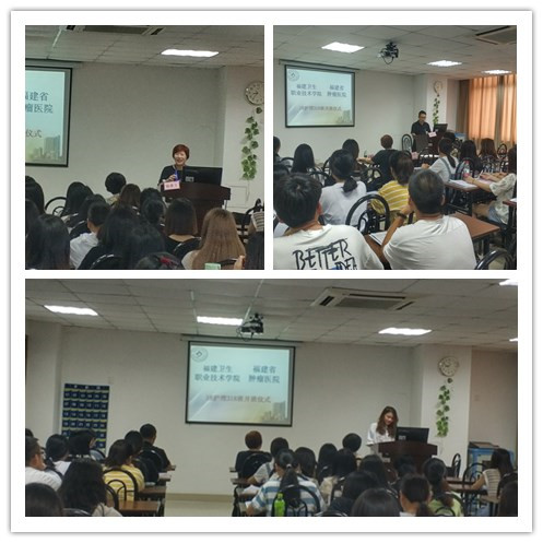 2019年9月2日上午8點(diǎn)30分,在福建省腫瘤醫(yī)院新綜合樓三樓示教室,福建衛(wèi)生職業(yè)技術(shù)學(xué)院聯(lián)合福建省腫瘤醫(yī)院舉行了2018級校企合作護(hù)理班開班儀式。出席開班儀式的校方代表有護(hù)理系林桂松副書記、輔導(dǎo)員吳薇老師,院方代表有福建省腫瘤醫(yī)院護(hù)理部駱惠玉主任、吳美華副主任、班主任鐘玲老師及各位課程負(fù)責(zé)人等,46名腫瘤班學(xué)生一起參加了開班儀式。