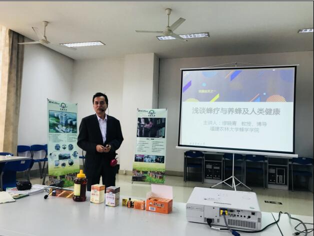 活動(dòng)剛開(kāi)始,蜂療研究所市場(chǎng)部經(jīng)理陳凌鷹向大家介紹了蜜蜂的基本知識(shí)和蜂療研究所的發(fā)展歷程。接下來(lái),蜂療研究所所長(zhǎng)、福建農(nóng)林大學(xué)蜂學(xué)院前院長(zhǎng)繆曉青教授結(jié)合蜜蜂健康文化,親自為大家講述了自己和蜜蜂的結(jié)緣故事以及他研究發(fā)明神蜂精的歷程,非常具有啟發(fā)意義。最后,來(lái)自蜂療醫(yī)院的醫(yī)生介紹了蜂療手法和療效,并為參與活動(dòng)的師生們現(xiàn)場(chǎng)實(shí)踐刮療手法,大家踴躍參與體驗(yàn),并紛紛表示這種蜂療手法效果顯著,體驗(yàn)感受很舒適。