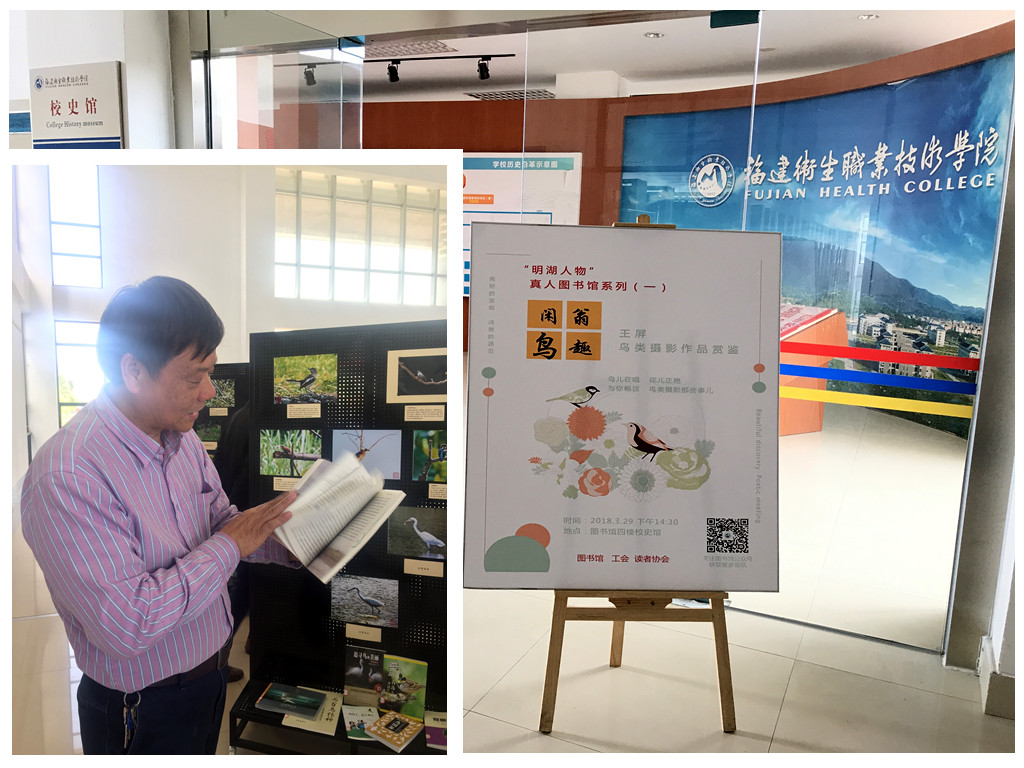 2018年3月29日14:30,圖書館在4樓校史館舉辦了第一期“明湖人物”真人圖書館,本期活動(dòng)主題是“閑翁鳥(niǎo)趣”鳥(niǎo)類攝影作品鑒賞,主講嘉賓是福建省觀鳥(niǎo)協(xié)會(huì)會(huì)員王屏老師(原我院后勤管理處處長(zhǎng)),學(xué)院工會(huì)副主席洪常青也蒞臨了本次活動(dòng)。