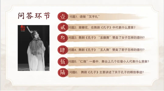 為了加深大家對本期古典舞劇《孔子》所涉相關(guān)知識的理解,活動設(shè)置了問答環(huán)節(jié),增強(qiáng)與觀眾的互動,調(diào)動現(xiàn)場氣氛。同學(xué)們積極舉手參與,侃侃而談。答對的同學(xué)獲得了圖書館精心準(zhǔn)備的文創(chuàng)紀(jì)念品。