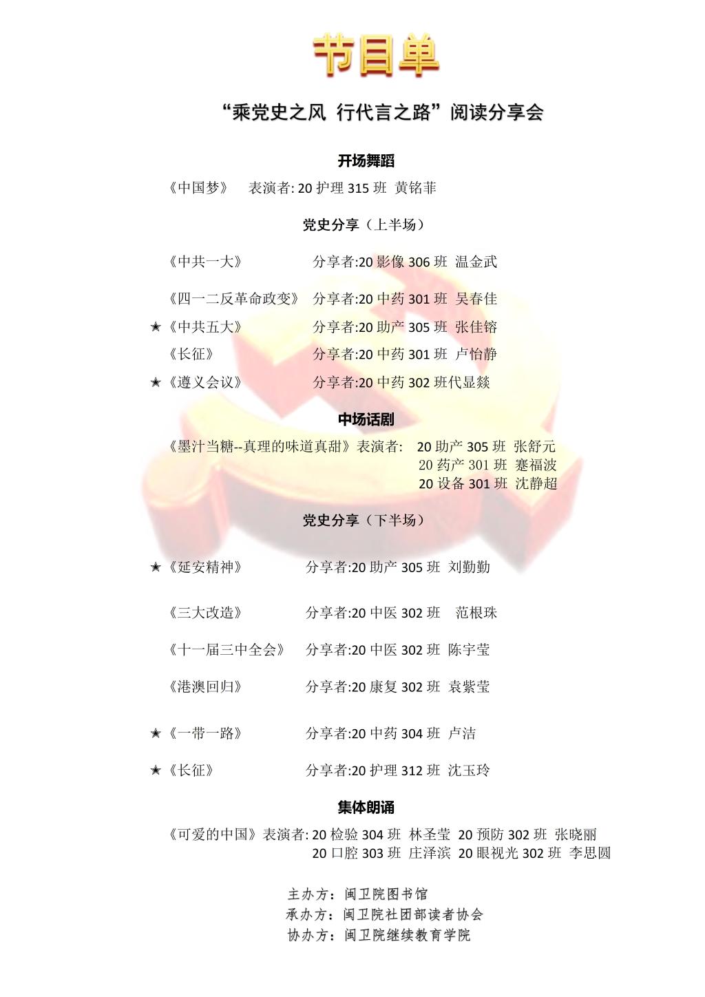 11位學(xué)生通過閱讀“中共一大”、“四一二反革命政變”、“中共五大”、“紅軍長征”、“遵義會議”、“延安精神”、“社會主義三大改造”、十一屆三中全會、“ 港澳回 歸”、“一帶一路”等黨史事件的相關(guān)書籍,分享自己的閱讀感悟。