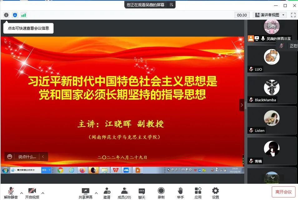 為幫助師生全面準(zhǔn)確深入領(lǐng)會(huì)習(xí)近平新時(shí)代中國(guó)特色社會(huì)主義思想,特別是黨的十九屆六中全會(huì)通過(guò)的歷史決議對(duì)習(xí)近平新時(shí)代中國(guó)特色社會(huì)主義思想的最新闡釋?zhuān)?022年8月29日,我校馬克思主義學(xué)院邀請(qǐng)閩南師范大學(xué)馬克思主義學(xué)院副教授江曉暉作題為《習(xí)近平新時(shí)代中國(guó)特色社會(huì)主義思想是黨和國(guó)家必須長(zhǎng)期堅(jiān)持的指導(dǎo)思想》的專(zhuān)題講座。講座由馬克思主義學(xué)院副院長(zhǎng)來(lái)朋珍主持,馬克思主義學(xué)院全體教師及部分學(xué)生代表參加。