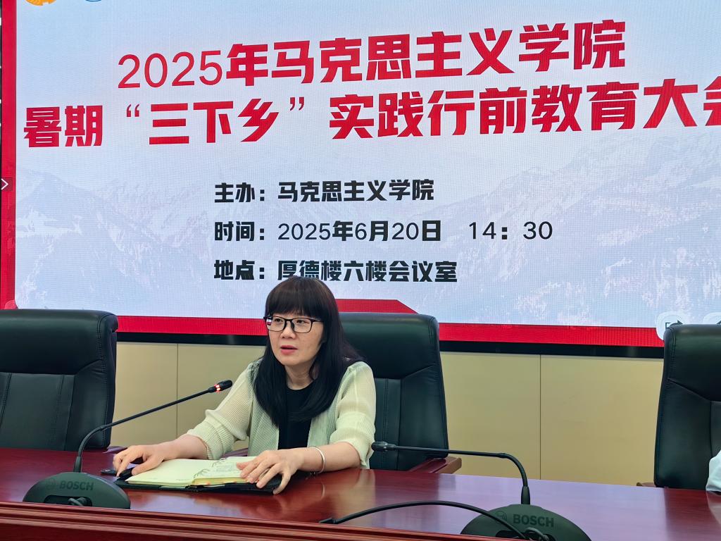 為深入學(xué)習(xí)貫徹習(xí)近平新時(shí)代中國(guó)特色社會(huì)主義思想,全面落實(shí)黨的二十大關(guān)于青年工作的重要部署,6月20日,馬克思主義學(xué)院在厚德樓六樓會(huì)議室舉行2025年暑期“三下鄉(xiāng)”社會(huì)實(shí)踐行前安全教育培訓(xùn)會(huì)。馬克思主義學(xué)院黨總支書(shū)記、院長(zhǎng)熊美蘭,副院長(zhǎng)來(lái)朋珍,第二黨支部書(shū)記胡濟(jì)林以及“馬上逐夢(mèng)隊(duì)”和“星火傳薪實(shí)踐隊(duì)”的指導(dǎo)老師和學(xué)生參加。會(huì)議由馬克思主義學(xué)院黨總支副書(shū)記賴(lài)文金主持。