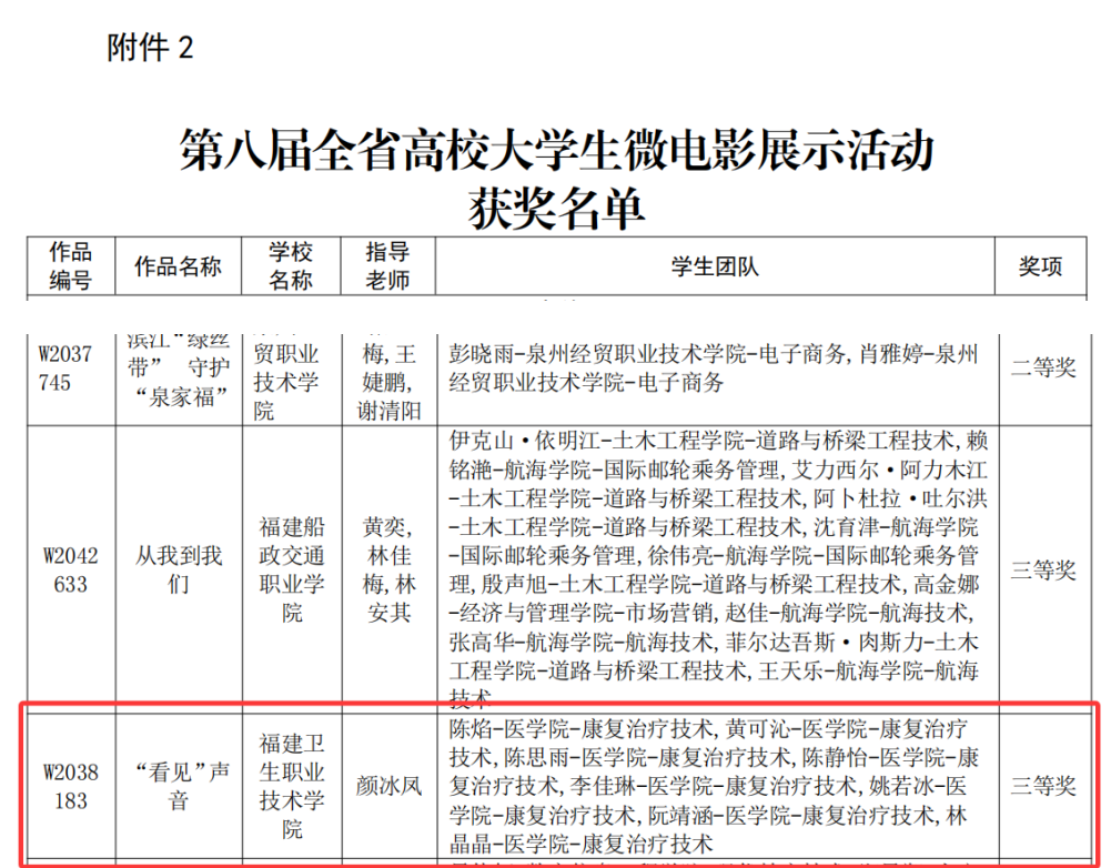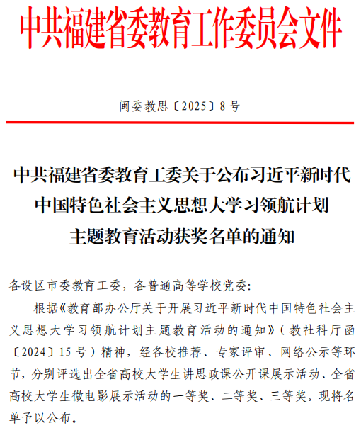 日前,由中共福建省委教育工作委員會主辦的習(xí)近平新時代中國特色社會主義思想大學(xué)習(xí)領(lǐng)航計劃系列主題活動獲獎名單揭曉,我校學(xué)生陳焰、黃可沁、陳思雨、陳靜怡、李佳琳、姚若冰、阮靖涵、林晶晶的微電影作品《“看見”聲音》獲得第八屆全省高校大學(xué)生微電影展示活動三等獎,指導(dǎo)老師為顏冰鳳。
