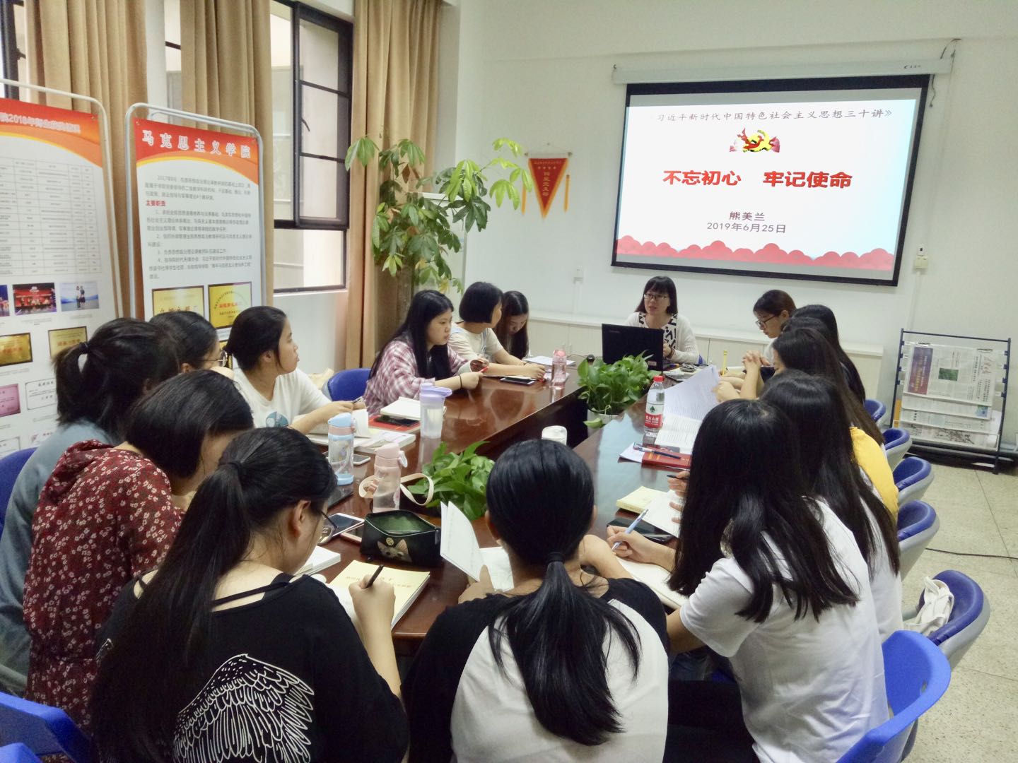 授課中,熊美蘭老師突出主題,首先分析了我們黨今年開展“不忘初心、牢記使命”主題教育的宗旨和意義,明晰“初心”是指為人民謀幸福,“使命”為中華民族謀復(fù)興,之后以歷史和實(shí)踐視角了解了我們黨為實(shí)現(xiàn)初心和使命的奮斗歷程中砥礪前行。中國共產(chǎn)黨一經(jīng)成立,就把實(shí)現(xiàn)共產(chǎn)主義作為黨的最高理想和最終目標(biāo),義無反顧肩負(fù)起實(shí)現(xiàn)中華民族偉大復(fù)興的歷史使命,團(tuán)結(jié)帶領(lǐng)人民進(jìn)行了艱苦卓絕的斗爭,譜寫了氣吞山河的壯麗史詩。