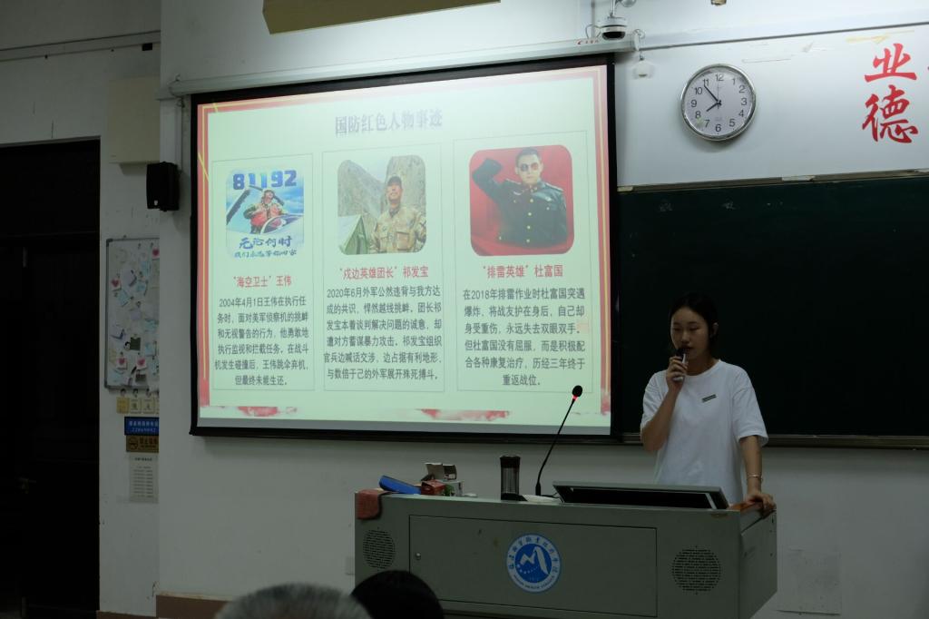 本次宣講小組成員是23中藥301班的陳瑩和王紫欣,宣講人是陳瑩,她宣講的主題是“強國復興,愛我國防”。陳瑩首先向大家講述了國防建設的涵義,接著從國防紅色故事、國防事業(yè)發(fā)展歷程兩個方面來展開講述,她通過播放微視頻,讓同學們領略我國國防力量從追趕、并跑再到領跑的偉大成就,最后結合大學生實際,提出八點行動建議。胡濟林進行精彩點評,希望同學們能通過這一宣講,堅定理想信念,為實現(xiàn)中國國防事業(yè)貢獻青春力量。