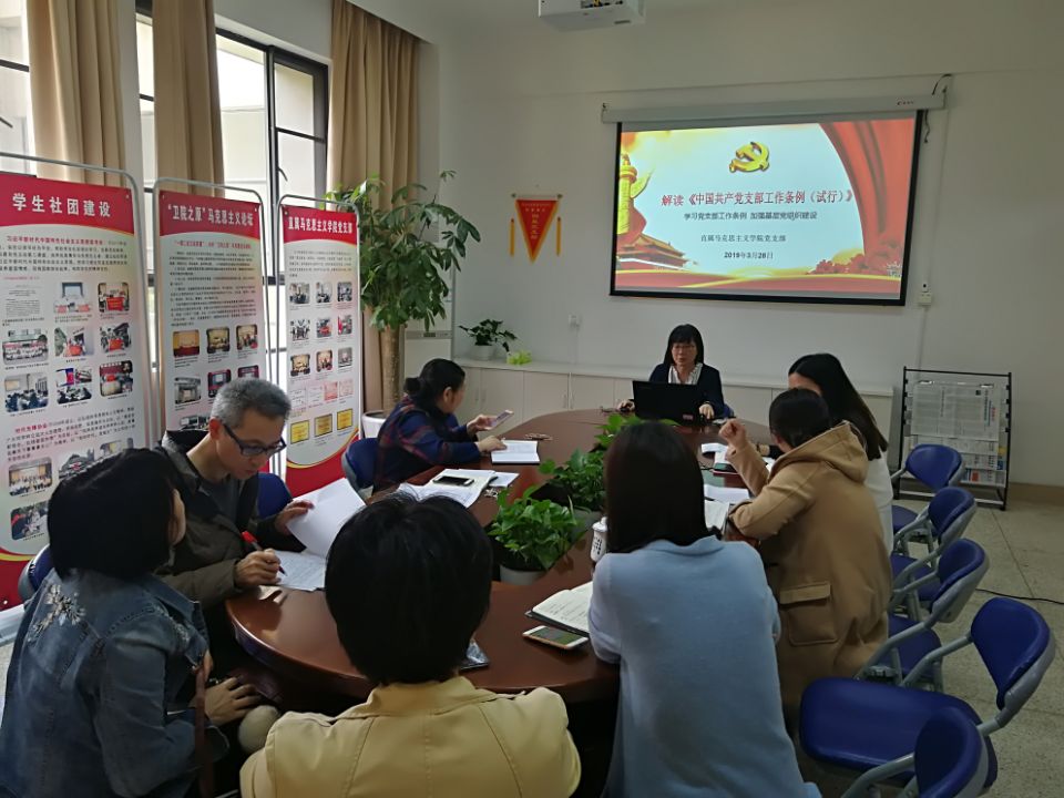 為使廣大黨員深入領(lǐng)會(huì)《中國(guó)共產(chǎn)黨支部工作條例(試行)》(后簡(jiǎn)稱《條例》)精神,全面掌握《條例》內(nèi)容,增強(qiáng)貫徹執(zhí)行《條例》的思想自覺和行動(dòng)自覺,2019年3月28日,直屬馬克思主義學(xué)院黨支部書記熊美蘭為支部全體黨員上黨課,宣傳解讀《條例》,支部全體黨員參加了這次學(xué)習(xí)。