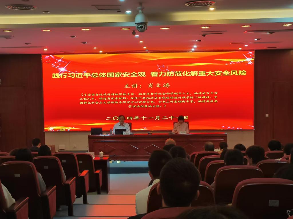為深入學(xué)習(xí)貫徹黨的二十大、黨的二十屆三中全會(huì)精神,深刻理解和把握總體國(guó)家安全觀,2024年11月21日,馬克思主義學(xué)院第一黨支部在篤行樓四樓報(bào)告廳開(kāi)展主題黨日活動(dòng),共同學(xué)習(xí)由國(guó)務(wù)院政府特殊津貼專(zhuān)家、福建省應(yīng)急管理培訓(xùn)基地主任、中共福建省委黨校福建行政學(xué)院肖文濤教授帶來(lái)的《踐行總體國(guó)家安全觀 著力防范化解重大安全風(fēng)險(xiǎn)》專(zhuān)題講座。