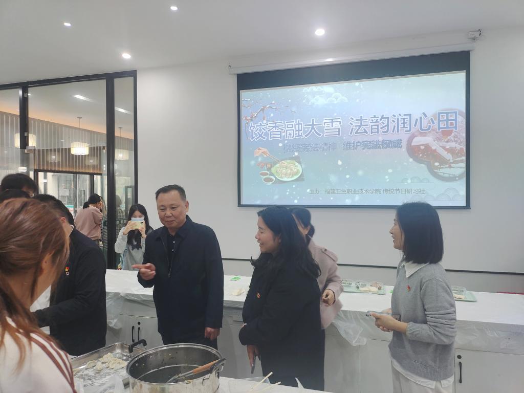 2024年12月5日,為推動(dòng)中華優(yōu)秀傳統(tǒng)文化與法治理念的深度融合,馬克思主義學(xué)院第一黨支部全體黨員教師在“憲法宣傳周”來(lái)臨之際,于“一站式”學(xué)生社區(qū)指導(dǎo)學(xué)生社團(tuán)開(kāi)展以“餃香融大雪,法韻潤(rùn)心田”為主題的特色活動(dòng)。
