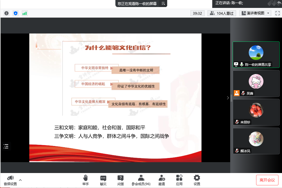 為幫助我校師生學(xué)習(xí)貫徹黨的二十大精神,從中華優(yōu)秀傳統(tǒng)文化中汲取思想精華,從百年黨史中感悟文化自信,2022年10月27日,我校馬克思主義學(xué)院邀請福建師范大學(xué)馬克思主義學(xué)院教授、博士生導(dǎo)師陳一收作題為《文化自信為實(shí)現(xiàn)中國式現(xiàn)代化提供強(qiáng)大精神支撐》專題講座。講座由馬克思主義學(xué)院副院長來朋珍主持,全體思政課教師及醫(yī)學(xué)技術(shù)系學(xué)生代表以線上方式參與。