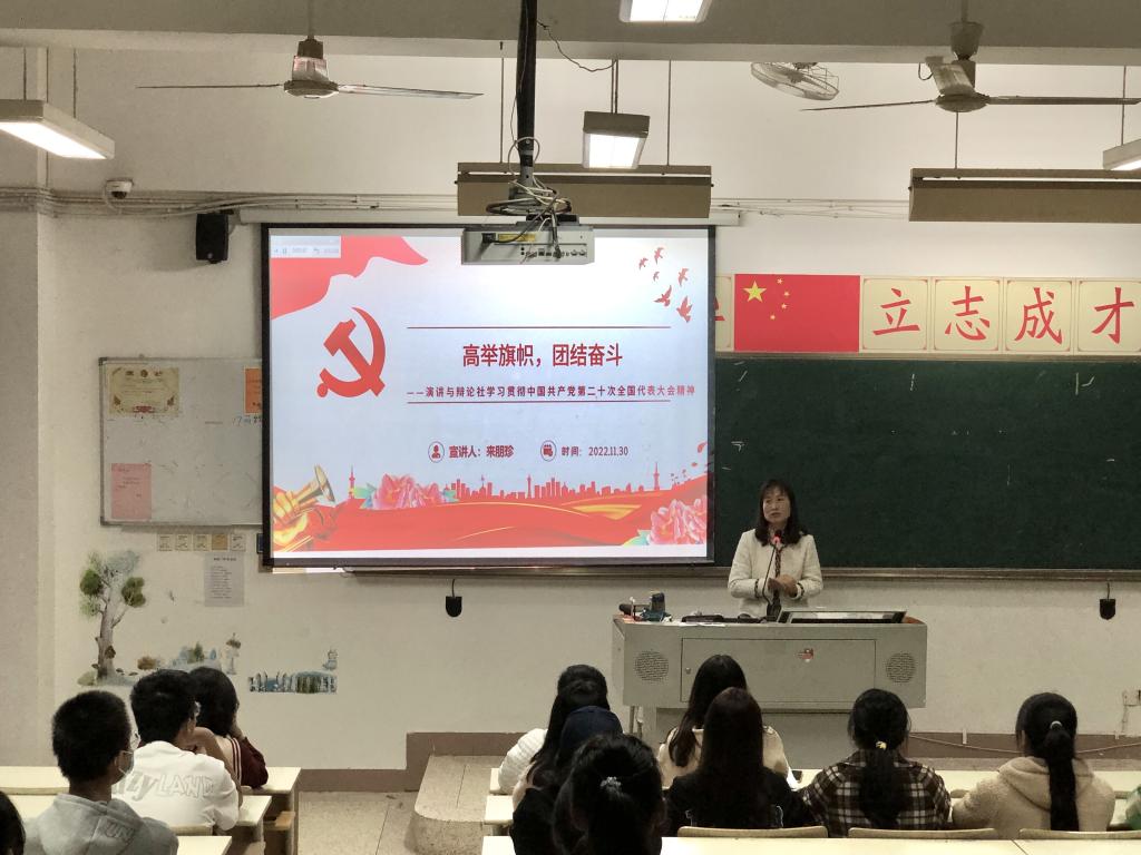 傳精神火種,聚奮進(jìn)力量。為深入學(xué)習(xí)宣傳貫徹黨的二十大精神,2022年11月30日,演講與辯論社指導(dǎo)老師來(lái)朋珍在教學(xué)樓315教室對(duì)全體社團(tuán)成員開(kāi)展了“高舉旗幟奮斗團(tuán)結(jié)”為主題的學(xué)習(xí)黨的二十大精神宣講。