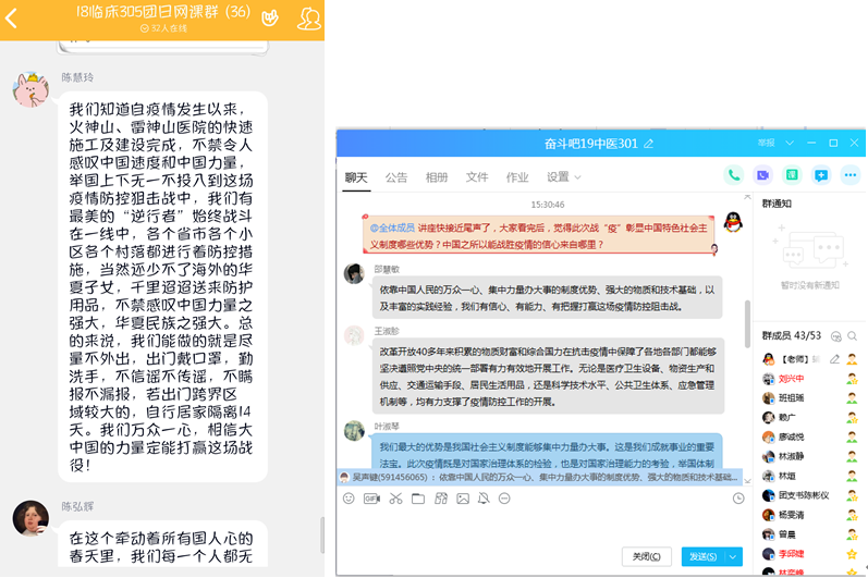 衛(wèi)院學(xué)子通過觀看疫情防控思政大課,結(jié)合自身實際,紛紛發(fā)表強烈感想?!白屛一匚稛o窮的是馮老師講的:我們最大的青春蛻變是走出孤芳自賞的‘小我’,走向擔(dān)當(dāng)民族復(fù)興責(zé)任的‘大我’,樹立責(zé)任意識與憂患意識。作為一名醫(yī)學(xué)生,我應(yīng)該刻苦學(xué)習(xí),積蓄報國的本領(lǐng)和才干,將來做一名大愛無疆、德技雙馨的好醫(yī)生!”19級臨床醫(yī)學(xué)專業(yè)的鐘露同學(xué)感觸頗深?!包h堅持以人民為中心,領(lǐng)導(dǎo)和依靠億萬人民群眾,堅定信心、同舟共濟、科學(xué)防治、精準(zhǔn)施策,展示了中國理念、中國速度、中國規(guī)模、中國效率,充分彰顯了中國特色社會主義的制度優(yōu)勢,也更加堅定了我入黨決心,以后我要處處嚴(yán)格要求自己,爭取早日入黨,那時候我也可以說‘我是黨員,我先上’!”19藥品生產(chǎn)技術(shù)專業(yè)董馨同學(xué)如是說?!澳嫘旭Y援,白袍加身,十七年前被保護(hù)的少年們,扛起了“白衣天使”的神圣使命。在新長征路上的新時代青年,要擔(dān)起實現(xiàn)民族偉大復(fù)興的責(zé)任,展現(xiàn)青年擔(dān)當(dāng)!”18級護(hù)理專業(yè)廖琳欣同學(xué)表達(dá)自己的想法?!榜R上就要畢業(yè)踏入工作崗位了,未來的我一定不忘“業(yè)精德誠”的校訓(xùn)和老師諄諄教誨,愛崗敬業(yè),用我所學(xué)治病救人、利國利民,并且讓患者感受到我發(fā)自內(nèi)心的真善美,有時去治愈、常常去幫助、總是去安慰。”17級學(xué)生動情地說。