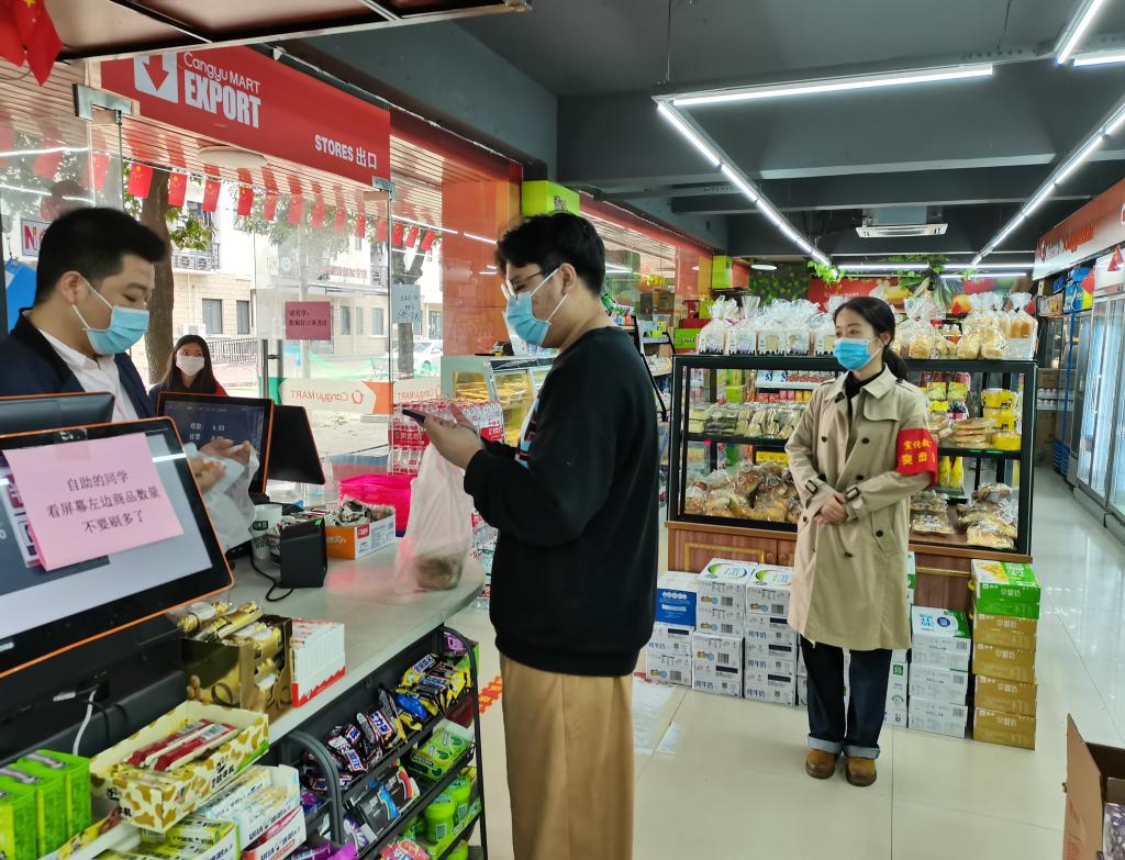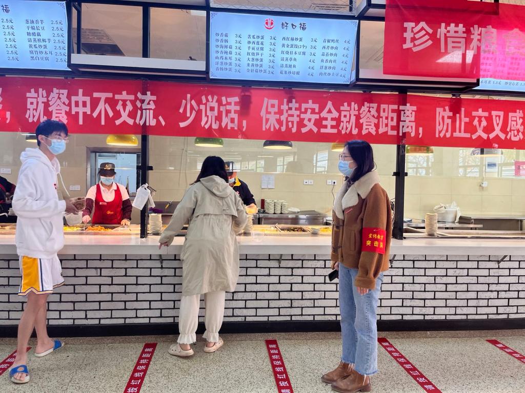 宣傳教育突擊隊在食堂、超市等校內(nèi)人流量大的區(qū)域迅速集結(jié),主動開展黨員志愿服務(wù),積極投入到秩序維護、防疫督導等各項工作中,以實際行動守護校園安全。