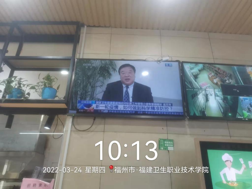 與此同時,督導各食堂大廳電視屏滾動播放防疫宣傳視頻,使廣大師生增強防疫意識,增長防疫知識。