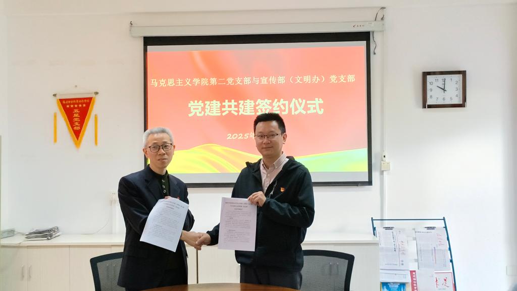 為進(jìn)一步深化黨建引領(lǐng)作用,推動(dòng)黨建與業(yè)務(wù)工作深度融合。2025年4月3日,宣傳部(文明辦)黨支部與馬克思主義學(xué)院第二黨支部在厚德樓107會(huì)議室舉辦黨建共建簽約儀式暨“緬懷革命先烈 傳承紅色基因”主題黨日活動(dòng),開啟了雙方黨組織合作交流的新篇章。