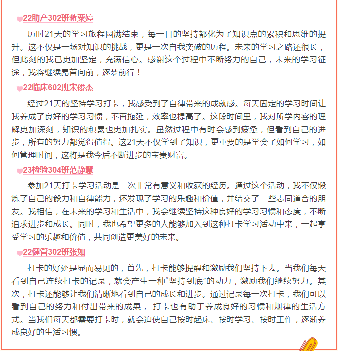 頒獎儀式上,學(xué)生工作部副部長張麗萍宣讀本次活動獲獎學(xué)生名單。獲獎學(xué)生代表22康復(fù)302班黃曉玲分享學(xué)習(xí)打卡活動心得,她表示,21天的學(xué)習(xí)打卡活動讓她收獲了堅持做一件事情的成就感,收獲了知識,也收獲了充實的每一天。