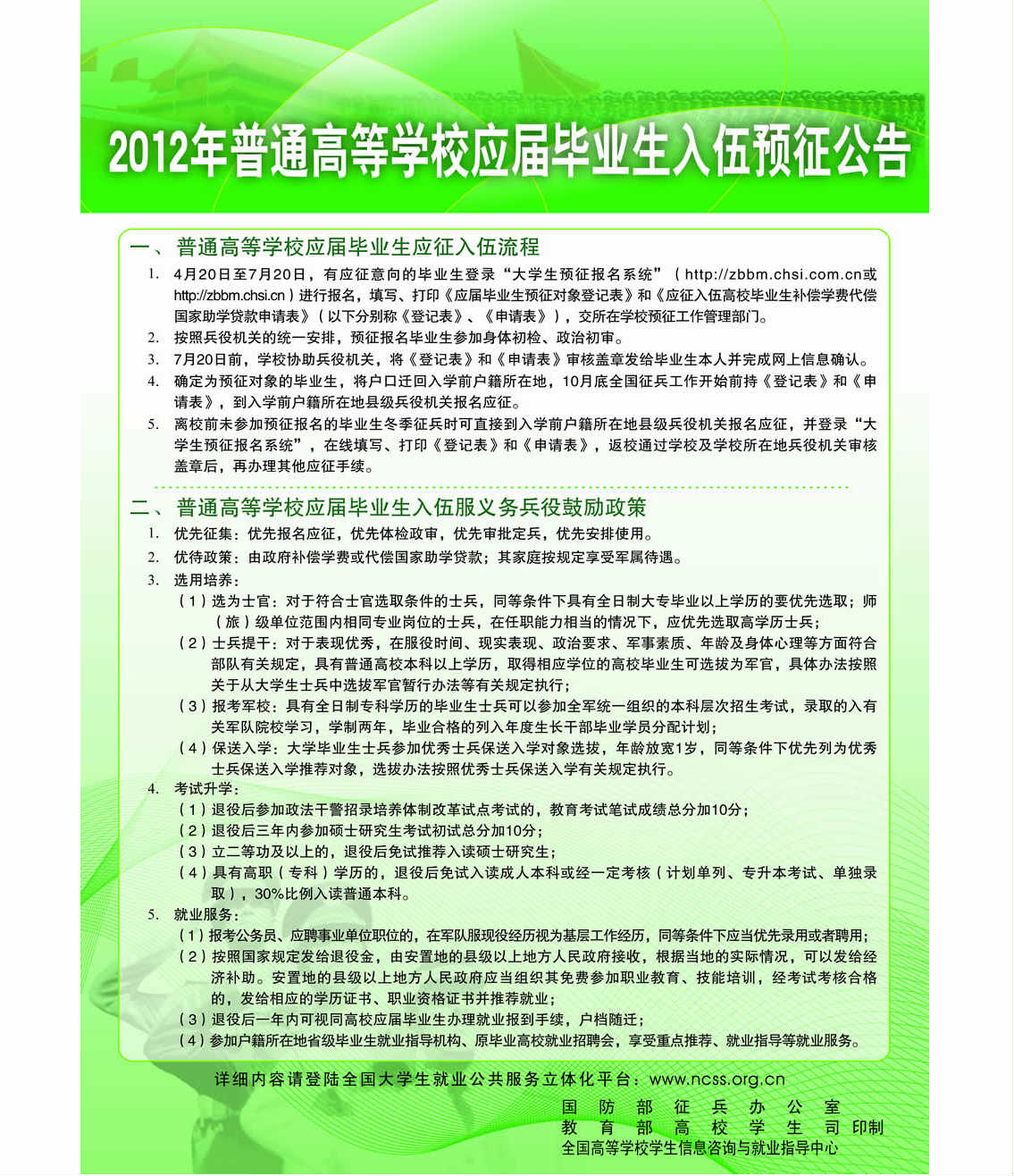 2012年普通高等學(xué)校應(yīng)屆畢業(yè)生入伍預(yù)征公告