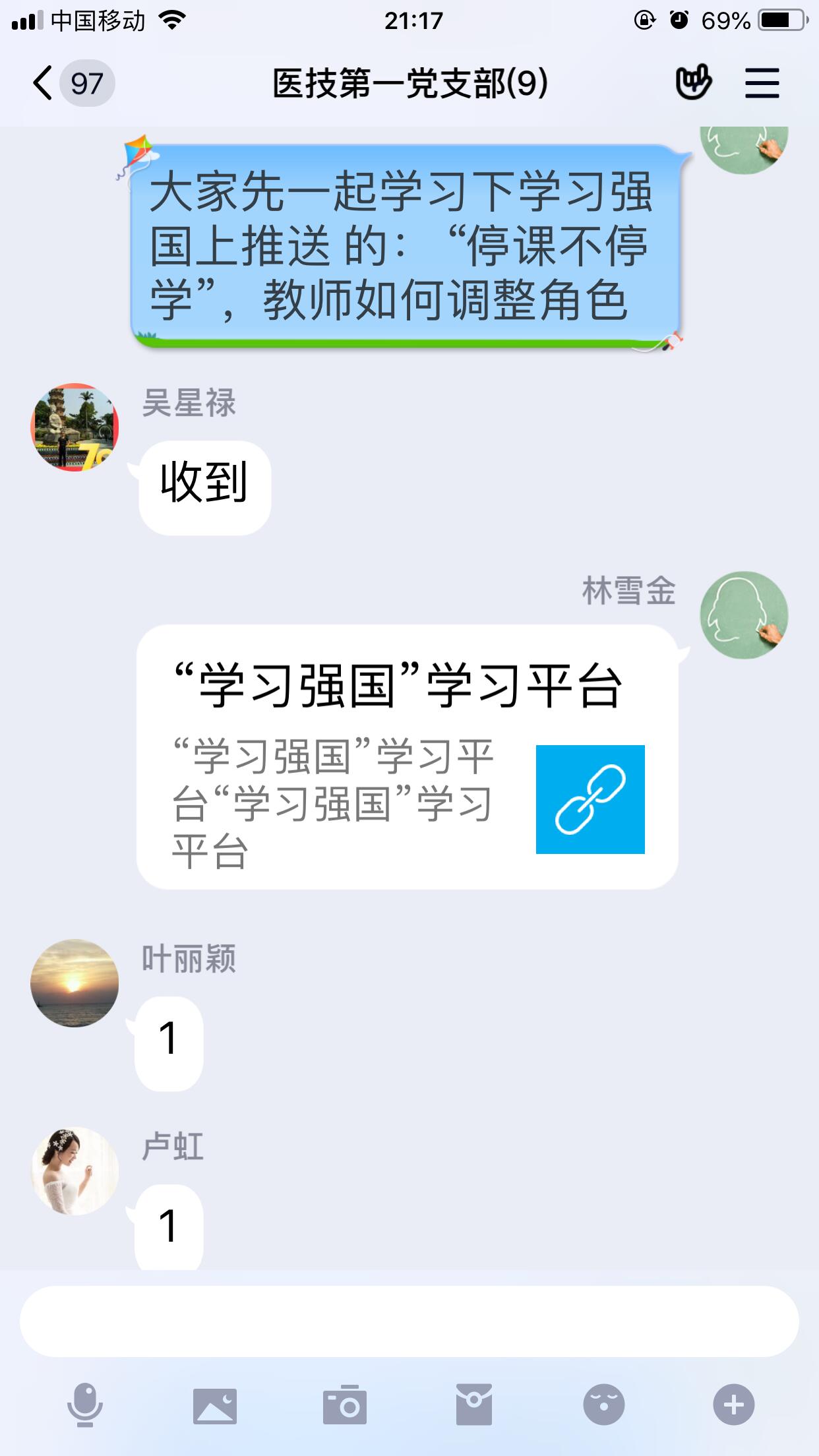 2月20日晚,在線學(xué)習(xí)的第四天,醫(yī)學(xué)技術(shù)系第一、第二和學(xué)生黨支部開展了一次特別的支部大會,圍繞“停課不停學(xué)”開展學(xué)習(xí)和討論,總結(jié)提升教學(xué)經(jīng)驗。黨員老師學(xué)習(xí)了習(xí)近平總書記在中央政治局常委會會議研究應(yīng)對新型冠狀病毒肺炎疫情工作時的講話,學(xué)習(xí)了《教育部應(yīng)對新型冠狀病毒肺炎疫情工作領(lǐng)導(dǎo)小組辦公室關(guān)于在疫情防控期間有針對性地做好教師工作若干事項的通知》,認真領(lǐng)會防疫工作重要精神和工作部署,進一步增強黨員教師對打贏這場戰(zhàn)“疫”的信心。同時,結(jié)合學(xué)習(xí)強國APP文章《“停課不停學(xué)”,教師如何調(diào)整角色》,教師黨支部著重從如何組織好在線教學(xué)開展了深入交流;學(xué)生黨支部則側(cè)重探討如何引導(dǎo)學(xué)生有效開展線上學(xué)習(xí)。大家都認為本次全課程的線上教學(xué)是一次培養(yǎng)學(xué)生自主學(xué)習(xí)能力的好機會,有效的指引、多樣的互動、及時的評價,可以達到較好的停課不停學(xué)效果。