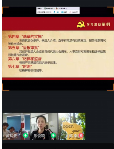 線上授課,凝聚共識(shí)。醫(yī)學(xué)技術(shù)系黨總支書記陳俊穎因公出差,采用線上授課方式為全體黨總支委員及各黨支部委員講授《學(xué)習(xí)貫徹條例》專題黨課。黨課從制定和實(shí)施《條例》的意義、《條例》的重點(diǎn)內(nèi)容學(xué)習(xí)、切實(shí)增強(qiáng)貫徹落實(shí)《條例》等三個(gè)方面展開,對(duì)《條例》進(jìn)行了全面詳細(xì)的解讀。培訓(xùn)中,與會(huì)同志共同深入學(xué)習(xí)了泉州市委組織部編寫,經(jīng)省委組織部組織一處審定的《〈中國共產(chǎn)黨基層組織選舉工作條例〉線上培訓(xùn)提綱》,并開展了在線學(xué)習(xí)自測(cè)。授課中,陳俊穎書記強(qiáng)調(diào)醫(yī)學(xué)技術(shù)系全體黨務(wù)干部要深入領(lǐng)會(huì)《條例》精神,全面掌握《條例》內(nèi)容,切實(shí)增強(qiáng)貫徹落實(shí)《條例》的思想自覺和行動(dòng)自覺。