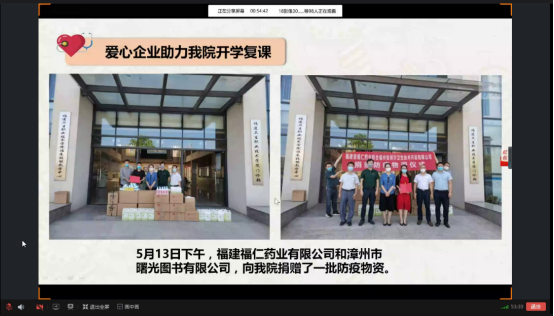 黃銘珊副院長還介紹了學院認真貫徹疫情防控工作要求,打響疫情防控的主動戰(zhàn)的各項工作情況。她特別和同學們分享交流了馳援武漢奮戰(zhàn)一線的優(yōu)秀校友事跡、校友企業(yè)捐贈防疫物資、黨員師生防疫行動情況,以及我們學校青年學子主動投身社區(qū)(鄉(xiāng)村)一線防疫服務(wù)的情況。