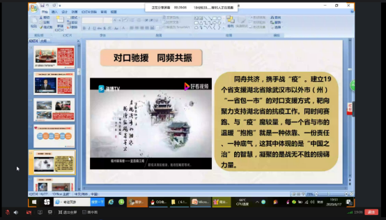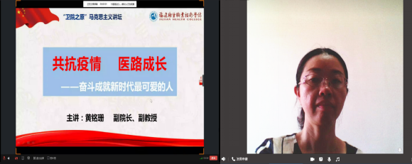 首先,黃銘珊副院長為同學們深入介紹了國內(nèi)外疫情的發(fā)展情況。她重點闡述了在黨中央的統(tǒng)一領(lǐng)導(dǎo)與精準施策下,全國人民眾志成城,我國疫情防控取得了階段性勝利。她還結(jié)合抗疫一線的典型案例,深入講述了在這場疫情防控阻擊戰(zhàn)中,全國各地的醫(yī)務(wù)工作者們、“兩山”醫(yī)院建設(shè)的工人們及其他各行各業(yè)奮斗們在抗疫一線的典型事跡。