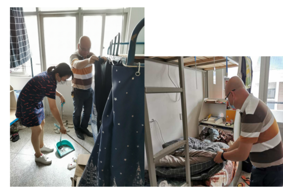 宿舍內(nèi)外都有老師們辛勤的背影,他們彎著腰,擼起袖子,不怕臟不怕累,用抹布仔仔細(xì)細(xì)的將桌椅、窗戶、床架柜子等擦拭一遍,不放過任何一?;覊m;廁所、浴室、陽臺、走廊......只為同學(xué)們返校時能有個整潔的宿舍環(huán)境??吹矫總€老師揮汗如雨、不辭辛苦的做好打掃工作,邱書記鼓勵大家說:“只要能讓同學(xué)們返校時住進(jìn)干凈整潔的宿舍,感受學(xué)校對他們的關(guān)心和關(guān)愛,哪怕我們再苦再累,流再多的汗也是值得的?!?