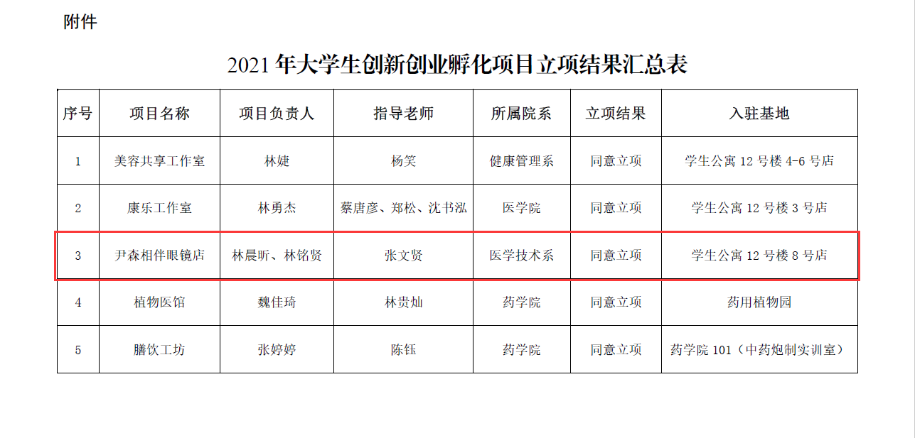 為充分發(fā)揮我校創(chuàng)新創(chuàng)業(yè)教育優(yōu)勢,提升人才培養(yǎng)質量,鼓勵有志于自主創(chuàng)業(yè)并符合條件的大學生進行創(chuàng)業(yè)實踐,打造學生創(chuàng)新創(chuàng)業(yè)實踐平臺,學校于2021年開展創(chuàng)新創(chuàng)業(yè)項目申報工作,經院(系)申報,校外專家評審、公示,學院審核,我系《尹森相伴眼鏡店》同意立項。