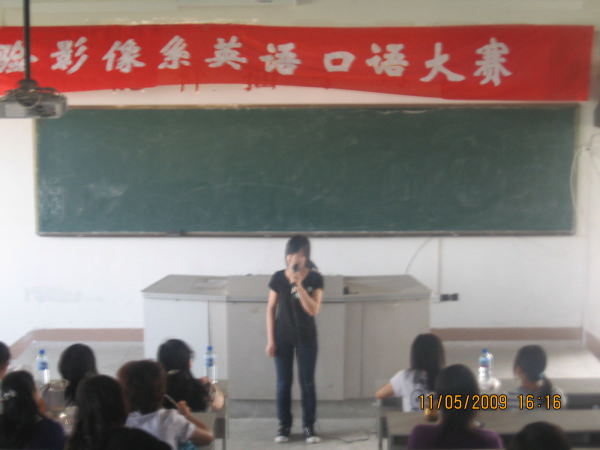 為響應(yīng)學(xué)院藝術(shù)節(jié)號(hào)召,檢驗(yàn)影像系于2009年5月12日下午在系部第2階梯教室舉行英語(yǔ)口語(yǔ)演講比賽。擔(dān)任此次比賽的評(píng)委是英語(yǔ)教研組的曹周英老師、張東方老師、李園源老師等九位老師。