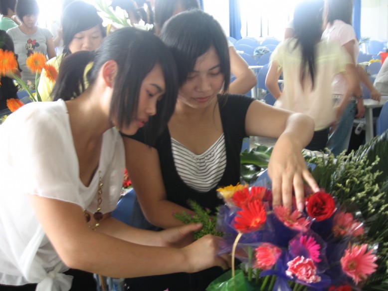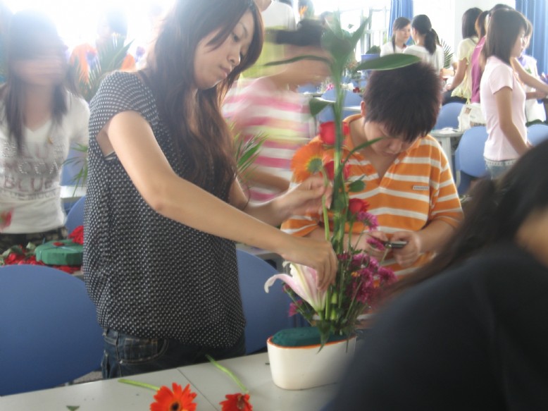 參賽選手多達(dá)60人,共29組?;ɑ苡邪俸?、玫瑰、滿天星、萬(wàn)年青、龜背竹等二十多種;器皿則有素雅花盆、玻璃花瓶、竹筒、藤籃等。同學(xué)們懷著對(duì)奧運(yùn)會(huì)的期盼、對(duì)四川災(zāi)區(qū)同胞的祝福和把母校建設(shè)成為一流高職高專(zhuān)類(lèi)院校的決心,充分發(fā)揮自己的想象力,把自己對(duì)生活和美的感悟,通過(guò)手中的一枝枝鮮花,淋漓盡致地表達(dá)了出來(lái)。