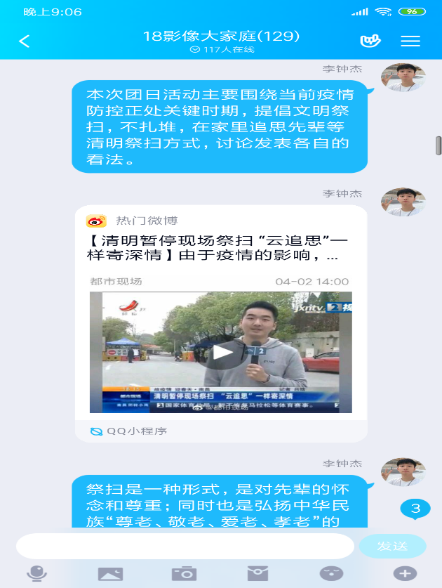 團(tuán)日活動中,就疫情防控時期的清明節(jié),如何進(jìn)行文明祭掃,防止人群扎堆展開討論。同學(xué)們紛紛建言獻(xiàn)策,號召市民群眾通過居家追思、網(wǎng)上祭奠等方式緬懷故人;或大力提倡鮮花祭奠、植樹祭奠、公祭悼念、撰寫感言體會等。