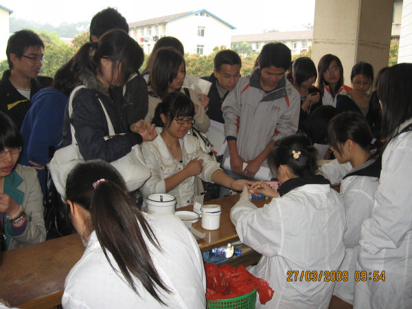 為體現(xiàn)醫(yī)務(wù)工作者救死扶傷的人文精神,檢驗(yàn)影像系聯(lián)合護(hù)理系于2009年3月28日走進(jìn)福州大學(xué)至誠學(xué)院開展主題為“學(xué)雷鋒,促交流,攜手文明衛(wèi)生,共創(chuàng)和諧至誠”的義工活動。 本次活動由檢驗(yàn)影像系團(tuán)總支、護(hù)理系團(tuán)總支和福州大學(xué)至誠學(xué)院學(xué)生會主辦,在策劃和籌備中,得到各方領(lǐng)導(dǎo)、老師的大力支持。我院由口腔教師馬清璇、邵旭媛帶隊(duì),共有53名學(xué)生參加。同學(xué)們在現(xiàn)場設(shè)立了ABO血型鑒定,測量身高、體重、肺活量、血壓、視力,辨色檢查和齲齒檢查等體檢項(xiàng)目。除了進(jìn)行結(jié)合專業(yè)的檢查外,師生們還認(rèn)真介紹口腔預(yù)防保健、血液、獻(xiàn)血等常識,并由護(hù)理專業(yè)學(xué)生進(jìn)行現(xiàn)場急救、止血包扎的互動示范。 此次活動體現(xiàn)出我院的教學(xué)成果以及專業(yè)特色,使同學(xué)們對本專業(yè)的知識有了更進(jìn)一步的了解和認(rèn)識,取得了滿意的效果。而且通過本次活動增強(qiáng)了兩院之間的交流,構(gòu)建和諧的校園文化。