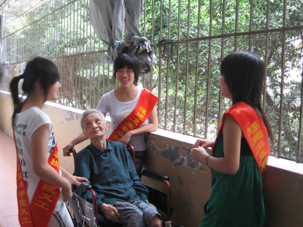 義工們一到敬老院,就向老人們噓寒問暖,了解老人們在這里的生活狀況,耐心地與他們交談。同學(xué)們還和老人一起唱歌,歌聲中流露出美好的期望,整個敬老院充滿了歡聲笑語。最后,義工們一起與老人們合影留念,同學(xué)們拉著老人的手戀戀不舍地惜別。