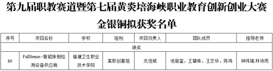 2023年7月31日至8月1日,第九屆福建省“互聯(lián)網(wǎng)+”大學(xué)生創(chuàng)新創(chuàng)業(yè)大賽職教賽道暨第七屆黃炎培海峽職業(yè)教育創(chuàng)新創(chuàng)業(yè)大賽在黎明職業(yè)大學(xué)舉行。我校報(bào)送的參賽項(xiàng)目《FallSense--智能摔倒檢測(cè)設(shè)備供應(yīng)商》在省賽網(wǎng)評(píng)中勝出,參加本次現(xiàn)場(chǎng)決賽并獲得銀獎(jiǎng)。