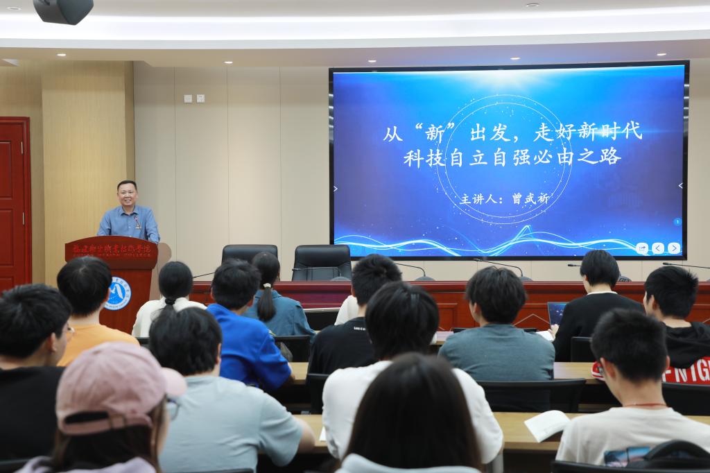 曾武祈從“戰(zhàn)略博弈:世界科技競(jìng)爭(zhēng)日趨激烈”“乘風(fēng)破浪:我國(guó)科技機(jī)遇挑戰(zhàn)共存”“勇立潮頭:加快科技自立自強(qiáng)步伐”“凝‘青’聚力:彰顯科技強(qiáng)國(guó)青春擔(dān)當(dāng)”等四個(gè)方面出發(fā),深入分析當(dāng)前世界的科技競(jìng)爭(zhēng)趨勢(shì),結(jié)合豐富案例闡述我國(guó)科技發(fā)展的機(jī)遇和挑戰(zhàn)。