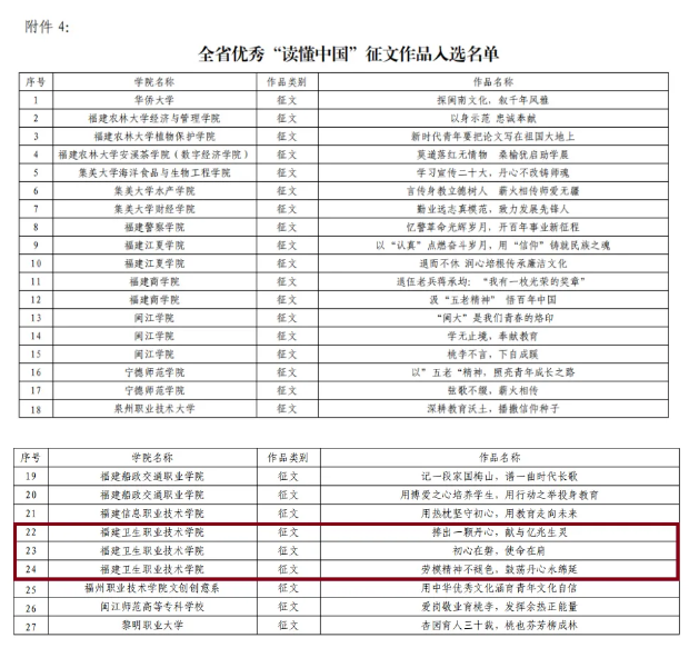 近日,福建省教育廳關(guān)工委通報(bào)2023年“讀懂中國(guó)”活動(dòng)作品評(píng)審結(jié)果,我校關(guān)工委獲全國(guó)優(yōu)秀組織獎(jiǎng),我院選送的《警心永向黨,余熱映初心》獲評(píng)全省最佳征文作品,《捧出一顆丹心,獻(xiàn)與億兆生靈》、《勞模精神不褪色,鼓蕩丹心永綿延》獲評(píng)全省優(yōu)秀征文作品。