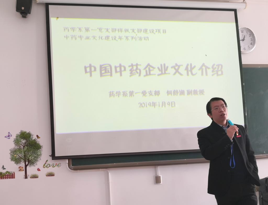 2020年1月9日,藥學系第一黨支部何舒瀾、林玲兩位同志在教學樓314為18級中藥全體同學開設講座——《中國中藥企業(yè)文化介紹》。