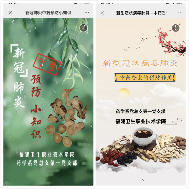 新型冠狀病毒突襲中國(guó),我院的疫情防控工作全面展開(kāi),正當(dāng)大家投身防疫工作之際,一個(gè)精美H5——“新冠肺炎中藥預(yù)防小知識(shí)”現(xiàn)身我院公眾號(hào),如何認(rèn)識(shí)新冠、如何用中藥防范新冠,如何正確戴口罩與洗手,這一個(gè)個(gè)實(shí)用的小知識(shí)為師生們的自我防護(hù)提供了專(zhuān)業(yè)指導(dǎo)。隨后,一個(gè)個(gè)宣傳防疫知識(shí)的H5如雨后春筍般此起彼伏,或宣傳84消毒液與酒精的正確使用,或宣傳辦公場(chǎng)所、學(xué)生群體的防護(hù)知識(shí)、或宣傳中醫(yī)對(duì)新冠的辨證診療與方劑使用、或倡導(dǎo)咳嗽、打噴嚏的文明禮節(jié)……這些貼近實(shí)際、實(shí)用性強(qiáng)、制作精美,受到師生喜愛(ài)的H5目前已有12個(gè),后續(xù)還將繼續(xù)增加,而這些H5均來(lái)自于藥學(xué)系的兩個(gè)教師黨支部。