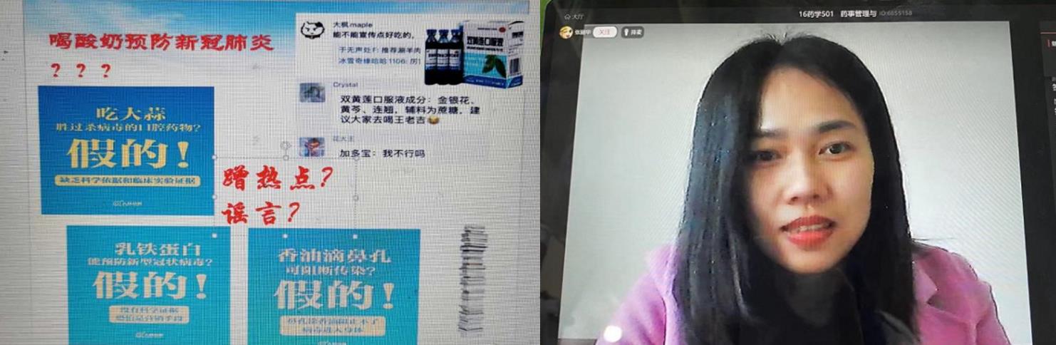 “佩戴口罩固然可以阻斷新冠病毒的飛沫傳播,但卻難以阻斷網(wǎng)絡(luò)“噴子”的飛沫傳播,培養(yǎng)學(xué)生的法律意識,幫助學(xué)生知法、守法,是《醫(yī)藥市場營銷》課程思政的切入點之一。” 藥經(jīng)管教研室主任鄭煒老師侃侃而談,她是藥學(xué)系第一黨支部的優(yōu)秀黨員,這段時間她積極響應(yīng)支部號召,組織人手制作了題為“萬眾一心,戰(zhàn)‘疫’有法”的H5,對疫情防控過程中容易被忽視的違法行為進行了宣傳,她主講的在線課程,通過“云班課”的頭腦風(fēng)暴功能,組織學(xué)生分析熱點事件,堅定守法意識,受到學(xué)生們的歡迎。