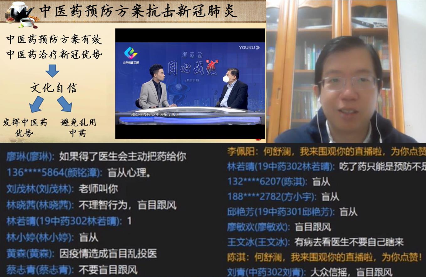 《中藥學(xué)》在線課程由藥學(xué)系第一黨支部書記,雙帶頭人何舒瀾老師主講,為保證在線教學(xué)的質(zhì)量,黨支部高度重視,從平臺的選擇到教學(xué)程序的安排,從課程內(nèi)容的講授到思政元素的融入,支部事先都做足了功課。在線課程從“一夜間‘雙黃連’成為比口罩還緊俏的存在”說起,引發(fā)學(xué)生對防控疫情期間部分民眾哄搶“雙黃連”這一事件的討論與思考,引申出中藥在疫情防控中如何發(fā)揮作用的問題,教育學(xué)生既要肯定中藥在防控疫情中的重要作用,樹立文化自信并激發(fā)民族自豪感,又要避免陷入亂用中藥的誤區(qū),堅持在中醫(yī)理論指導(dǎo)下正確使用中藥。短短十幾分鐘的互動,不僅圍繞時政熱點激發(fā)學(xué)生共鳴做到思政教育,同時也在專業(yè)層面講清了中藥的含義,全程學(xué)生積極參與,踴躍發(fā)言,取得了良好的效果。