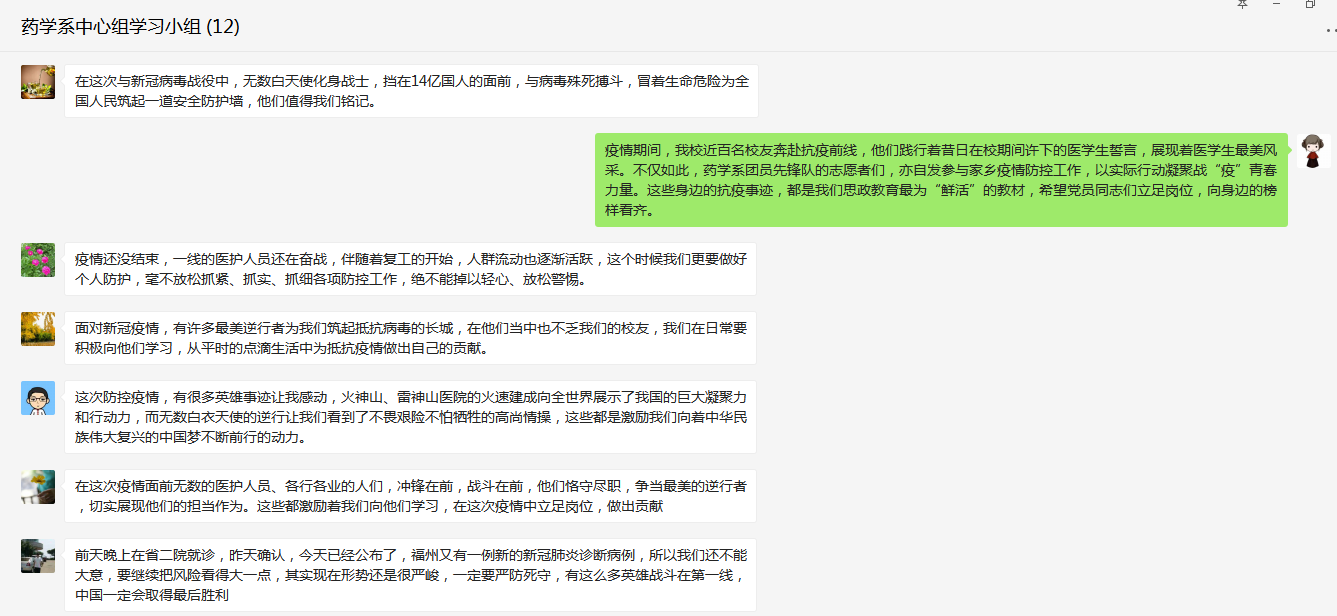 2020年2月27日,藥學(xué)系黨總支在微信群召開中心組學(xué)習(xí)(擴(kuò)大)會(huì)議,集中學(xué)習(xí)抗擊新冠病毒的中國(guó)故事,會(huì)議由藥學(xué)系黨總支書記鄭力宏主持。