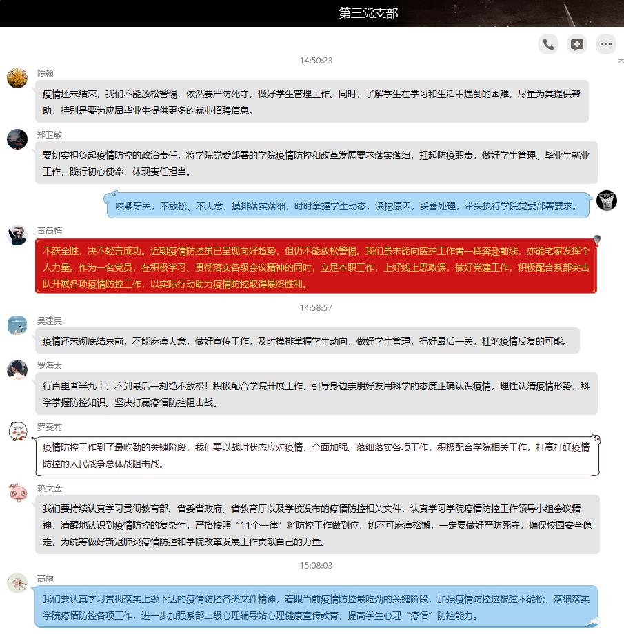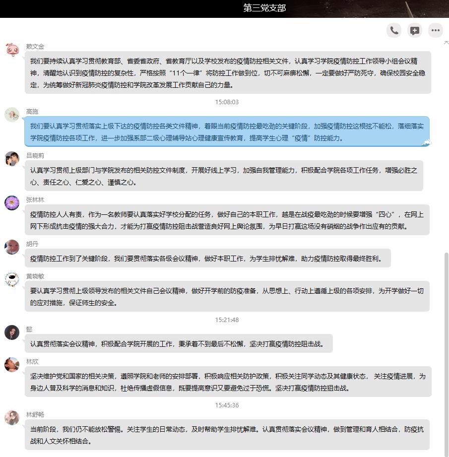 通過本次集中學(xué)習(xí),支部全體黨員面對(duì)疫情的站位進(jìn)一步提高、覺悟進(jìn)一步提升,全體師生黨員普遍認(rèn)為,在疫情緊要關(guān)口更要咬緊牙關(guān),認(rèn)清疫情防控的復(fù)雜性與嚴(yán)肅性,立足本職、嚴(yán)防死守、做好“11個(gè)一律”,確保校園安全穩(wěn)定,為統(tǒng)籌新冠肺炎疫情防控和學(xué)院改革發(fā)展貢獻(xiàn)自己的力量。