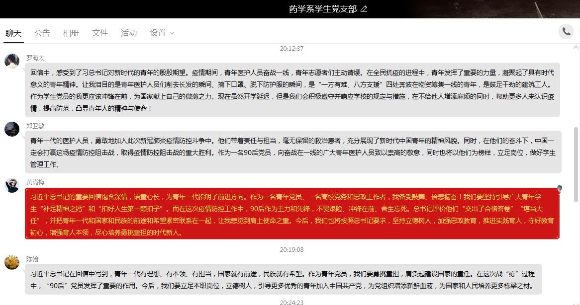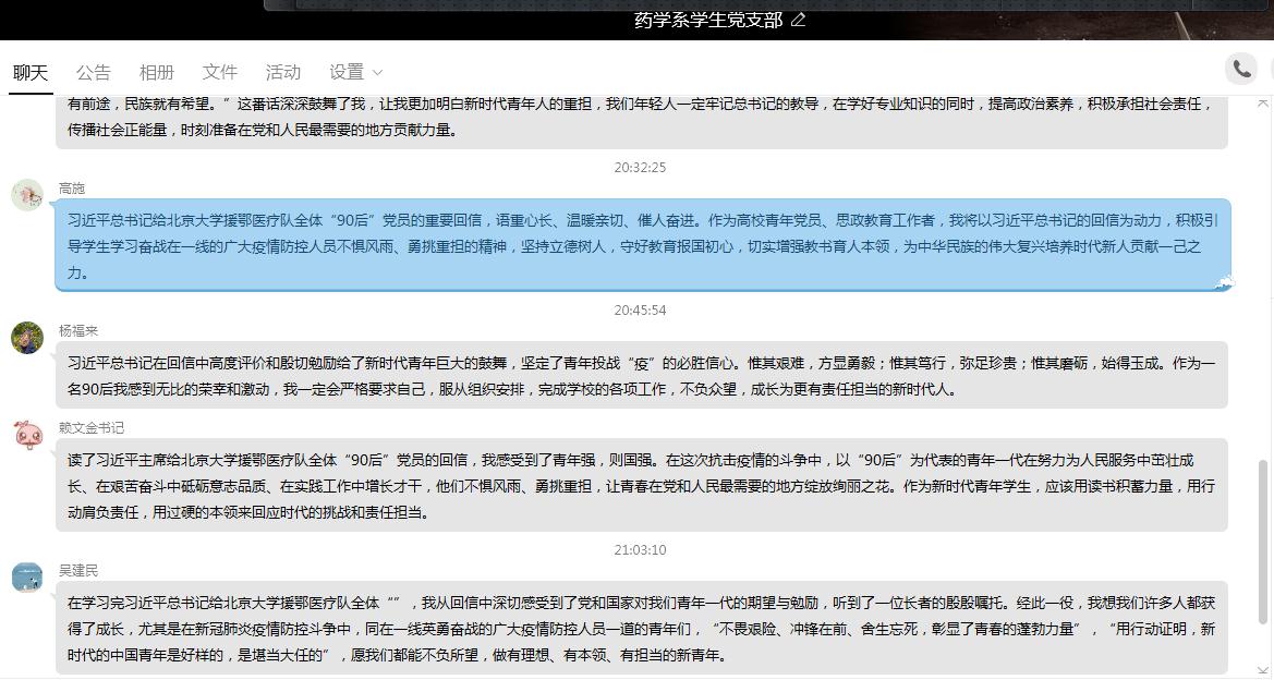 近日,北京大學(xué)援鄂醫(yī)療隊的34名“90后”黨員給習(xí)近平總書記寫信,匯報了在抗疫一線搶救生命的情況,表達了繼續(xù)發(fā)揮黨員作用、為打贏疫情防控阻擊戰(zhàn)貢獻力量的決心??倳?月15日回信,激勵新時代青年要不懼風(fēng)雨、勇挑重擔(dān),讓青春在黨和人民最需要的地方綻放絢麗之花。據(jù)此,3月28日,藥學(xué)系學(xué)生黨支部開展主題黨日活動,學(xué)習(xí)習(xí)近平總書記給北京大學(xué)援鄂醫(yī)療隊全體“90后”黨員的回信精神。