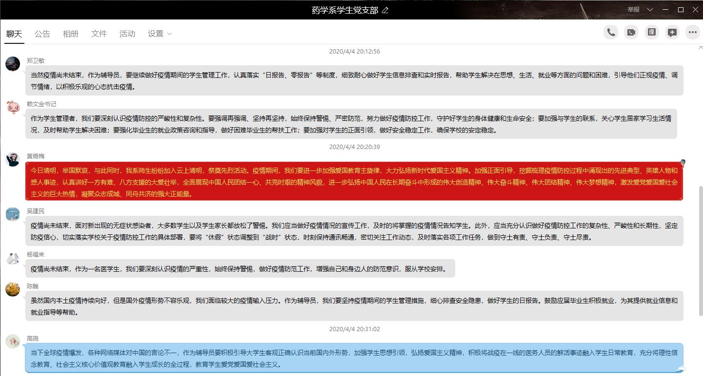 4月4日,藥學(xué)系學(xué)生黨支部通過QQ平臺集中學(xué)習(xí)福建省教育廳統(tǒng)籌推進高校疫情防控和教育教學(xué)管理工作視頻會議精神。